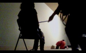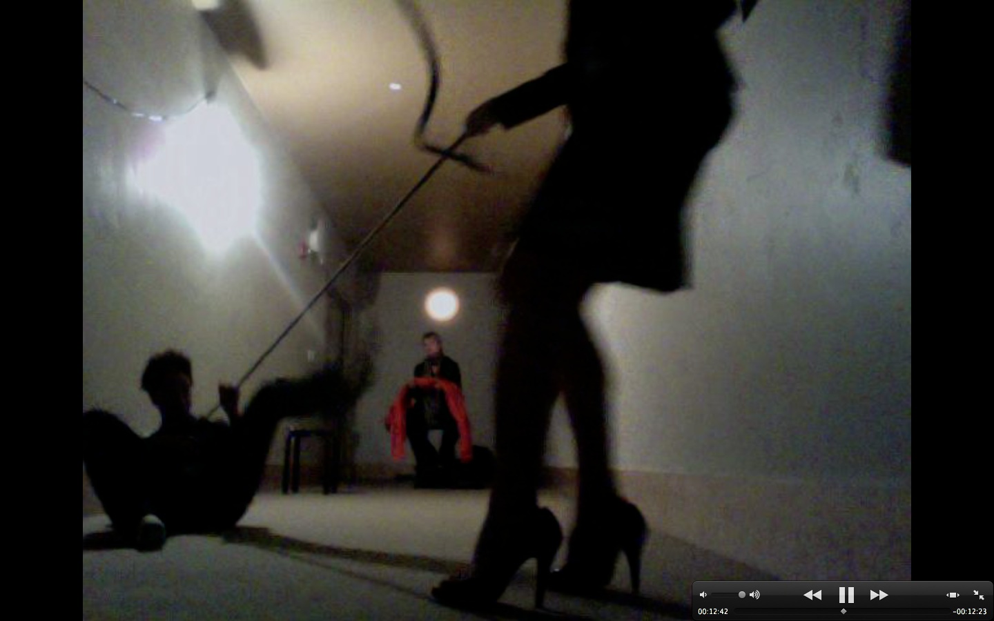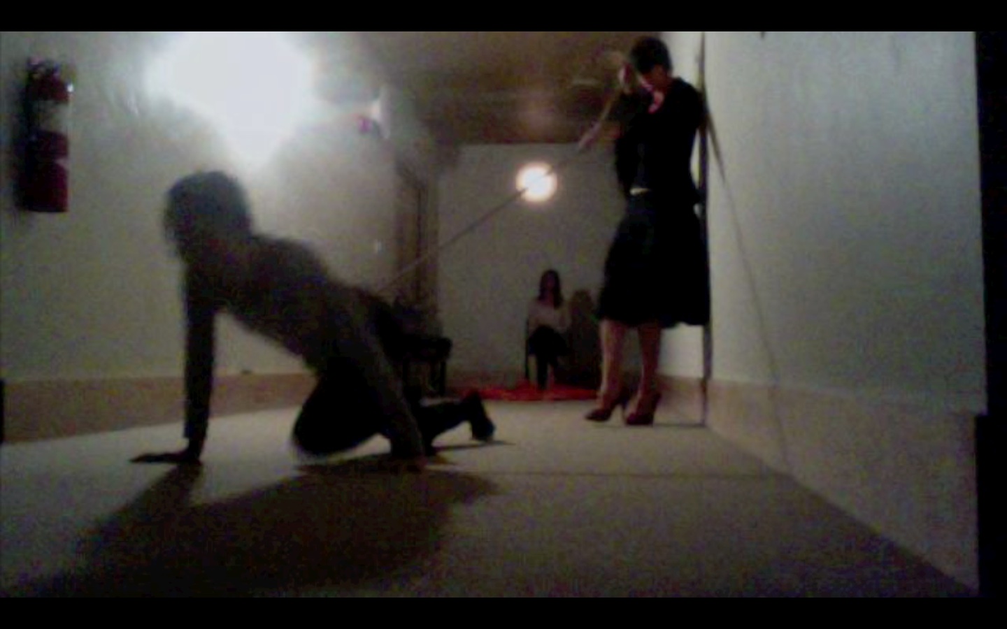 The woman is blindfolded, barefoot, and wears black gloves. She moves across the lower level of the narrow performance space. In close proximity to my chair, and to my right there is another woman wearing a sexy dress suit and shiny red high heel shoes. Her face is marked by ink. She utters the instructions to be followed by the performer. “OFF THE WALL!” / “ON YOUR KNEES!” The proximity between me and her makes looking at her, the choreographer, a conscious decision.