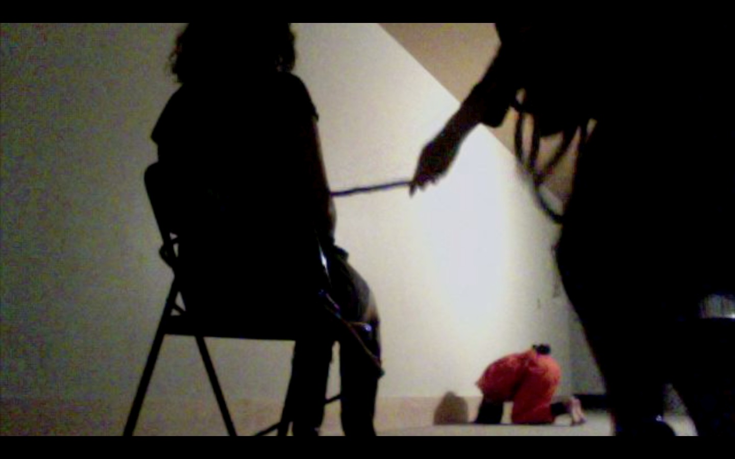 In the next minutes, the performer in the orange jump suit will give me her black gloves; she will also ask me to slip my hands into the knot of a thick rope. The choreographer will wrap the rope around me. The performer, still blindfolded, will take my hair away from my ear and whisper the phrase she was repeating when I entered the space. Breaking the sentence in fragments she will ask me to repeat. “Your,” “my,” “mine,” “body” are transferred. Hers is now mine, like in the accounts of those who typed the testimonies of people who had been tortured. The choreographer will set another type of transfer: with the same recorder in which I recorded my name before entering this space, she will capture my voice while I utter the sentence: your body has become not yours/ only nor left my body mine only. The choreographer captures my body. Although I am at this point tied, the recording is perhaps more unsettling an action than being tied. I am leaving a trace, entering an archive. I become paranoid but the terms are set: I follow every directive I receive, out of pure performance convention. As in the Milgram experiment, I trust the system, I respond as expected.